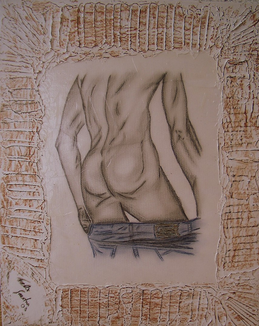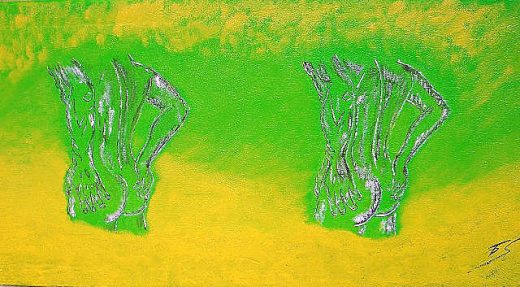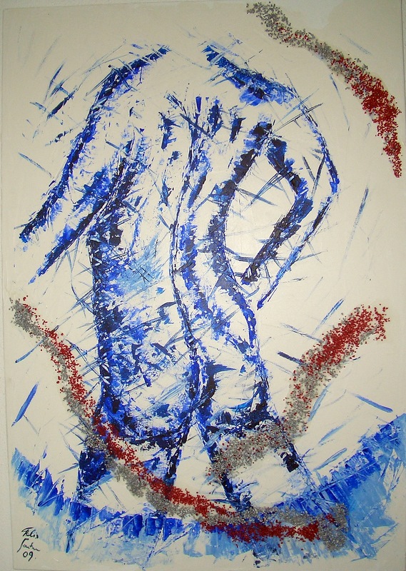 Grösse: 80 x 120 cm Mischtechnik auf Leinwand Dieses Bild habe ich für den Verkaufsraum eines Schuhgeschäftes gemacht. Als Materialien wurden u. a. Ausschnitte von ital. Zeitschriften verwendet.