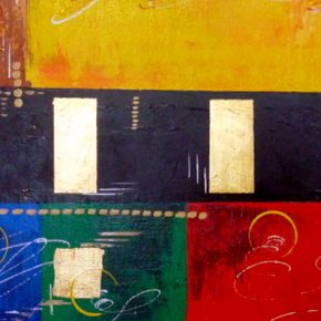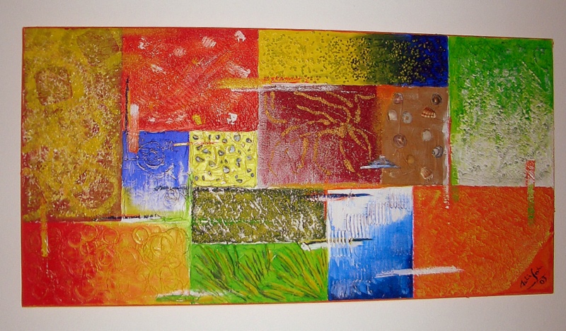 Grösse: 80 x 100 cm Mischtechnik auf Leinwand In diesem Bild habe ich für die verschiedenen Strukturaufträge u. a. Materialen wie Kaffebohnen, Eierschalen oder Papierschnitzel verwendet.