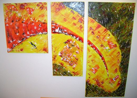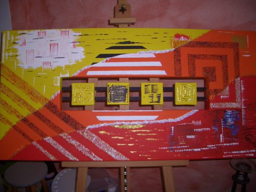 Grösse: 70 x 130 cm Mischtechnik auf Leinwand Keilrahmen-Spezialanfertigung (im mittleren Teil keine Leinwandbespannung) Bei diesem Bild habe ich u. a. verschiedene Strukturpasten sowie Kaffebohnen als Strukturmaterial verwendet. Für den Mittelteil habe ich kleine Leinwände, welche auf quadratischeContinue reading