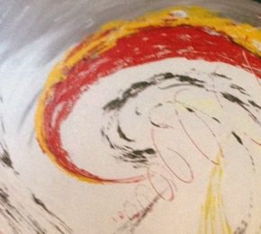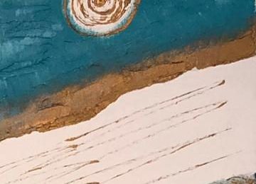 Grösse: 80 x 100 cm Mischtechnik auf Leinwand In diesem Bild habe ich für die verschiedenen Strukturaufträge u. a. Materialen wie Kaffebohnen, Eierschalen oder Papierschnitzel verwendet.